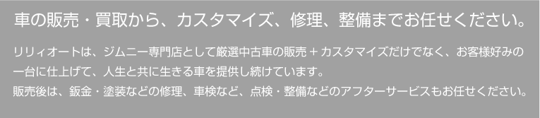 本当の車の楽しさを教えてくれたジムニーと共に 私たちリリィオートは、ジムニーに乗るオーナーさまと共に、10年先も20年先も人生と共に生きるジムニーを作り続けていくことが私たちの願いです。 乗り手、作り手としてジムニーの魅力を共に分かち合える仲間と、リリィオートを通じて出会えたたくさんの人の支えやご縁に感謝して・・・。